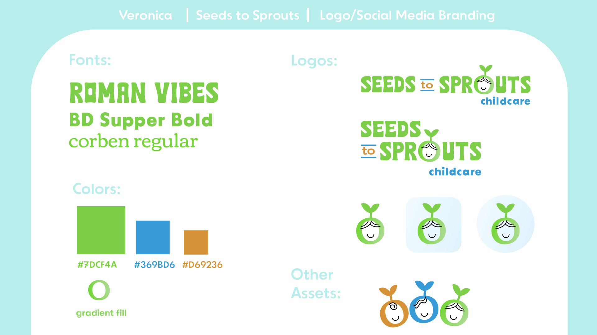 The brand utilizes bright, playful colors and whimsical designs inspired by nature. The branding is meant to appeal to children and parents alike, establishing an immediate feeling of professionalism, trust and integrity in Veronica’s business.